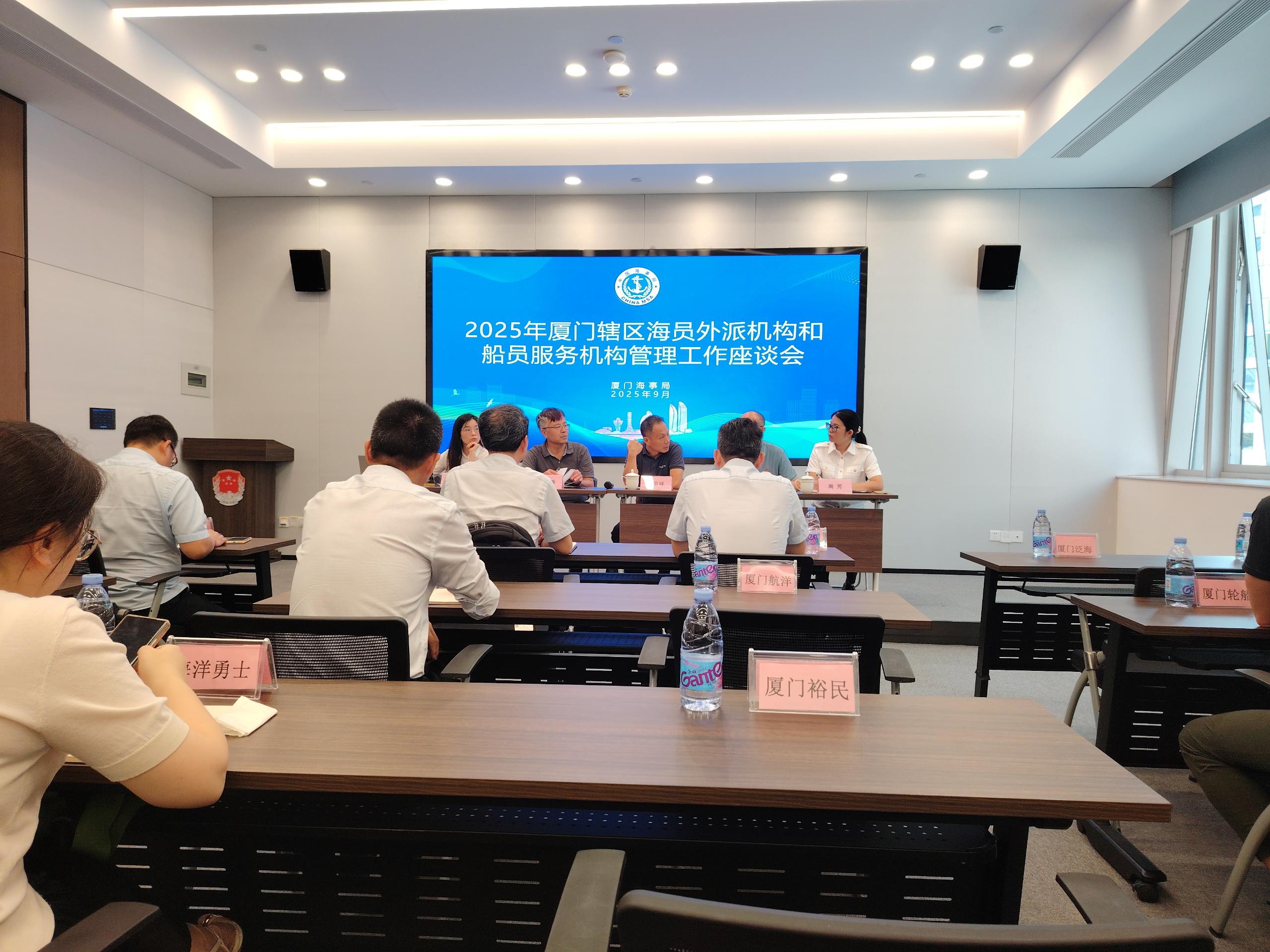 廈門海事局召開2025年度轄區(qū)海員外派機構、船員服務機構船員管理工作座談會,廈門海盈海運有限公司應邀參加此次工作座談會,并作為船員服務機構的代表就提升船務服務管理質(zhì)效、推進船員產(chǎn)業(yè)發(fā)展等方面做主題發(fā)言。